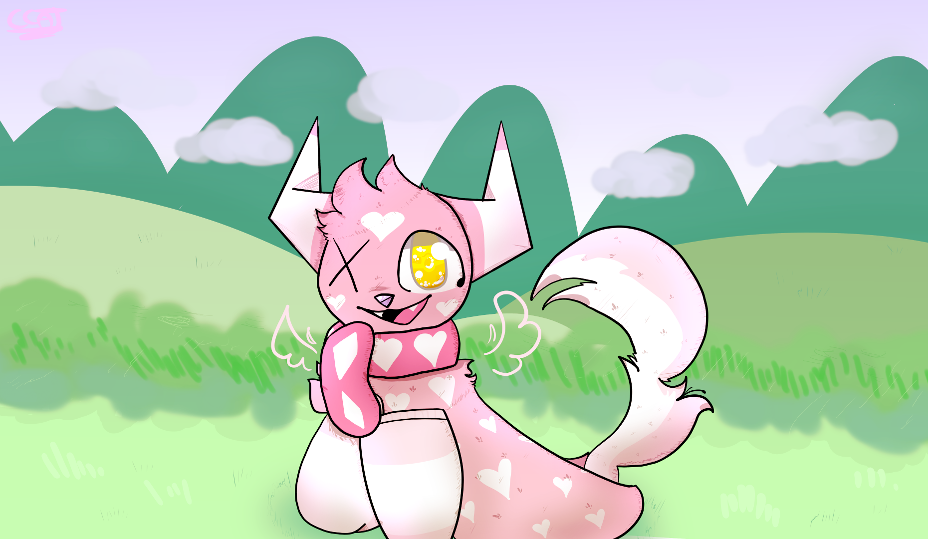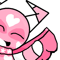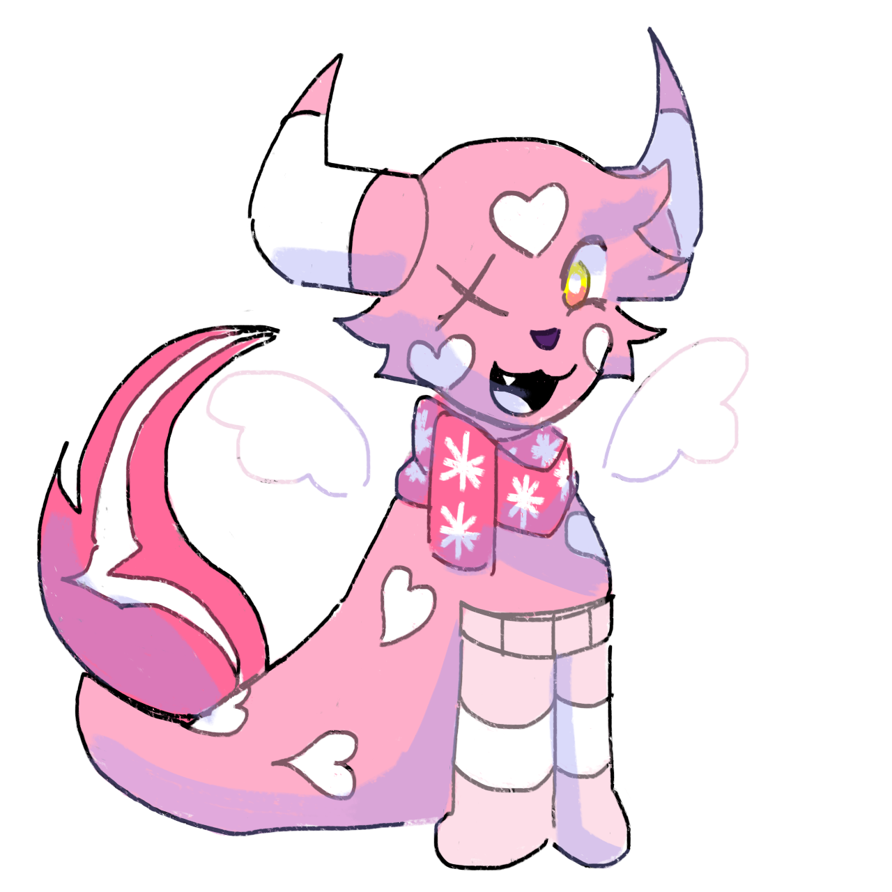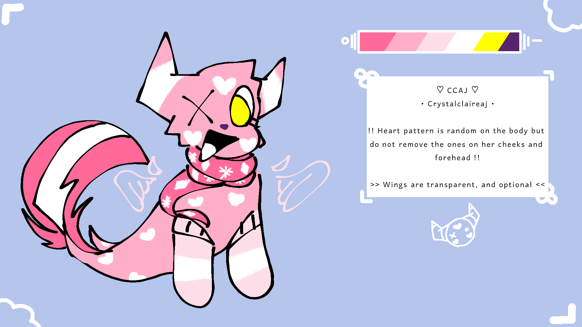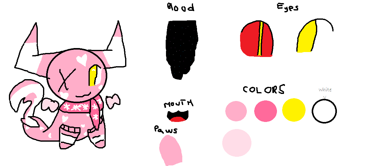A bright pink skin with heart shaped pattern covered on her like wallpaper. There should be one heart on both of her cheeks and forehead. Candy cane horns sprout at the sides of her head, it looks similar as takin horns. She has two tails, a puffy skunk-like tail and the main seal hind flippers used for swimming. She also has translucent pink wings that appear and disappear whenever she wanted to.