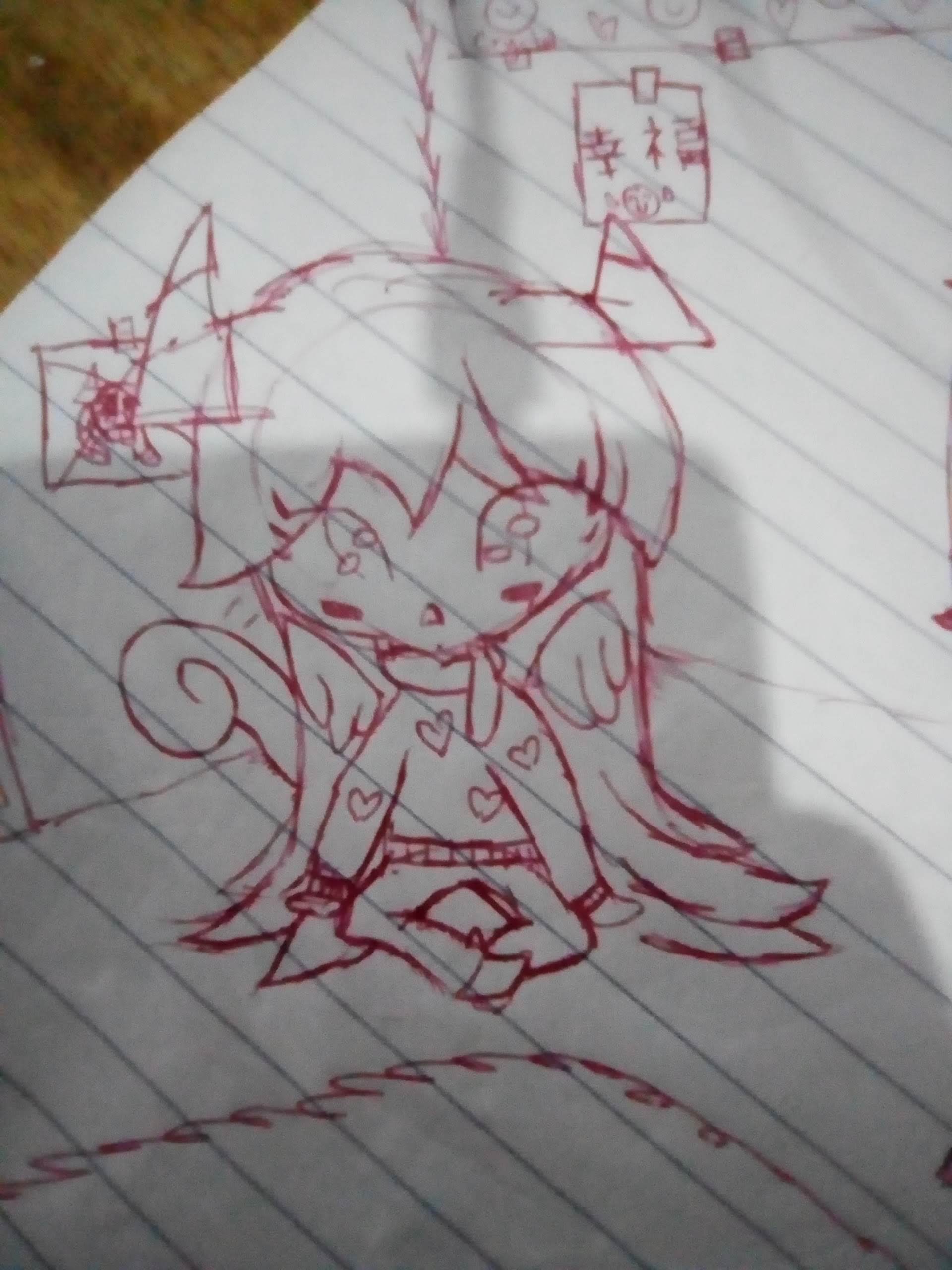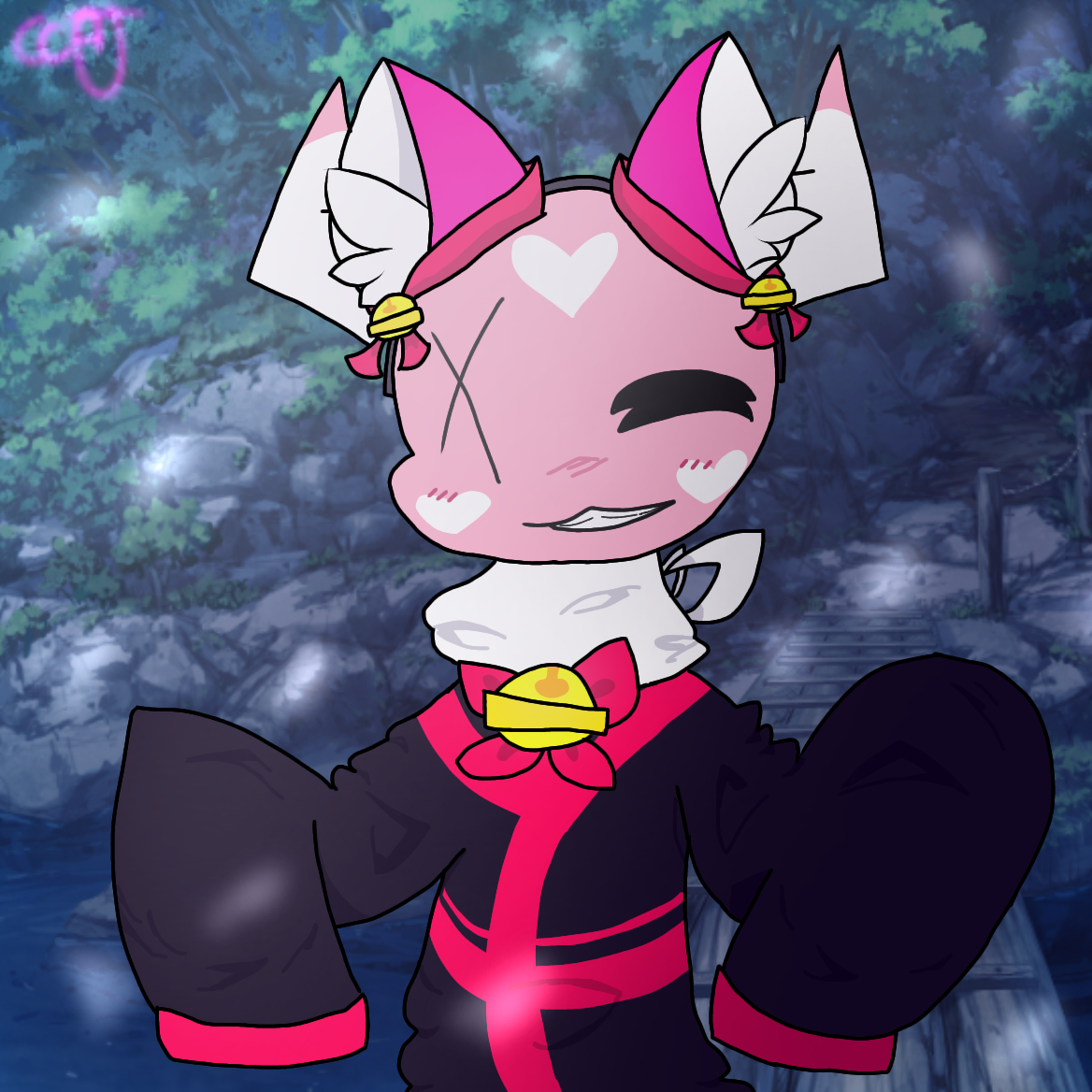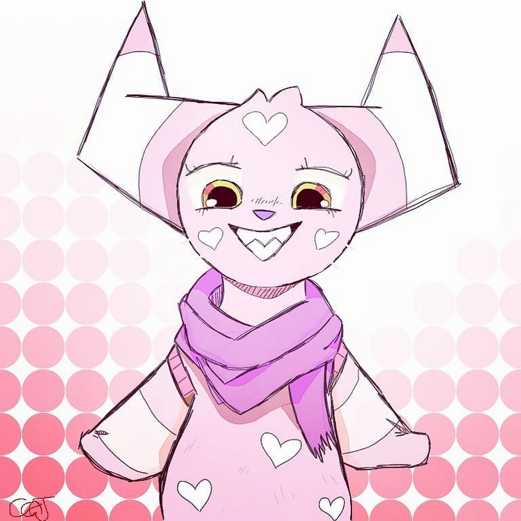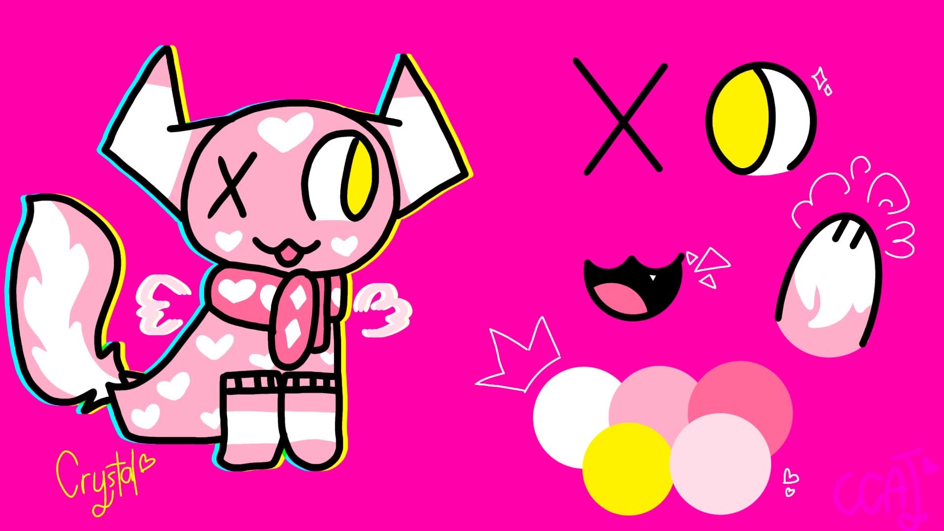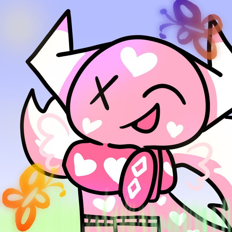 A bright pink skin with heart shaped pattern covered on her like wallpaper. There should be one heart on both of her cheeks and forehead. Candy cane horns sprout at the sides of her head, it looks similar as takin horns. She has two tails, a puffy skunk-like tail and the main seal hind flippers used for swimming. She also has translucent pink wings that appear and disappear whenever she wanted to.