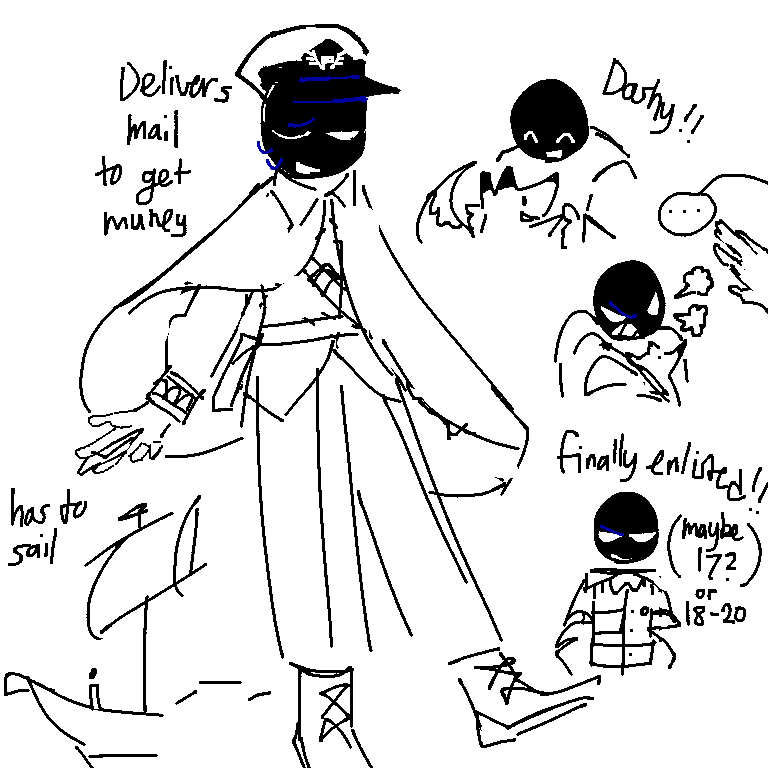 He used to “work” as a mailman to get money. Prewar msp!cmandy would sneak out of school or home to deliver mail and just go missing for a couple of days ← delivering mail typically takes an hour if it’s local or 2 months if it’s overseas. And yes! He loves sailing (he got it from his father bringing him to his work for a couple days)
